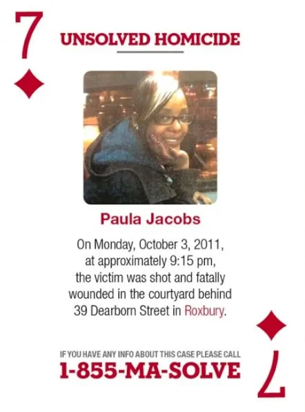 On Monday, October 3rd, 2011, 23-year-old Paula Jacobs was shot in the courtyard behind 39 Dearborn Street in Roxbury at approximately 9:15 p.m. Police arrived on scene and Paula was brought to the hospital where she tragically died of her injuries. Anyone with any information is asked to please call the Boston homicide unit at 617-343-4470 or 1-855-MA-SOLVE.