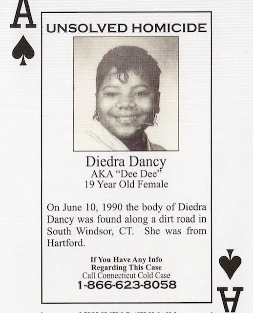 On June 10th, 1990 in South Windsor Connecticut, a group of fisherman were walking down a dirt utility road off of Pierce Road when they came across the body of a young woman wrapped in a shower curtain. The woman was determined to be 19-year-old Diedra “Dee Dee” Dancy from Hartford, Connecticut, and she had been missing for less than 48 hours. Diedra had also been stabbed several times. In the late 80’s and early 90’s there were a series of murders that were very similar to Diedra’s, and all of the women were abducted, murdered and then dumped in a different location. A man named Alfred Swinton was convicted on one of the murders based on bite mark analysis, however after 18 years of imprisonment Alfred was exonerated by the Innocence Project in 2018. No other arrests have ever been made in Diedra’s murder and the case has grown cold. Anyone with any information on the murder of Diedra Dancy is asked to please call the Connecticut cold case hotline at (866) 623-8058.
