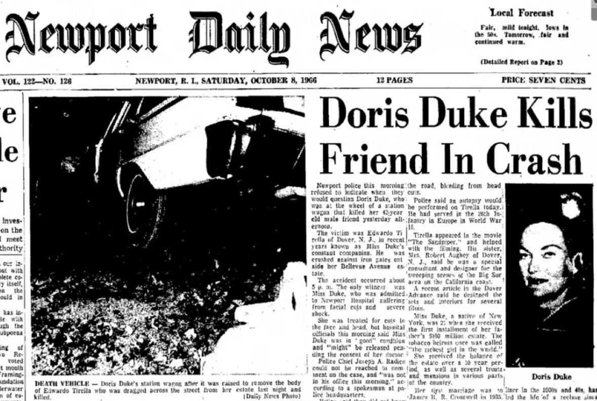 Doris was found at the steering wheel inside of the car, and she remained silent while the officers attempted to ask her questions as if she were in shock. Police Chief Joseph Radice arrived on scene, ushering Doris back inside her mansion before she was taken to Newport Hospital. Dr. Philip C. McAllister ensured Doris had a private room away from the prying eyes and invasive questions of police, who were told by Dr. McAllister that Doris was in no shape to answer their questions due to her being in shock. Dr. McAllister happened to be the acting state medical examiner at the time, and Doris had hired him as her own doctor. Author Peter Lance had written, “In effect, the man legally charged with determining the official cause of death had gone on Doris Duke’s payroll.”