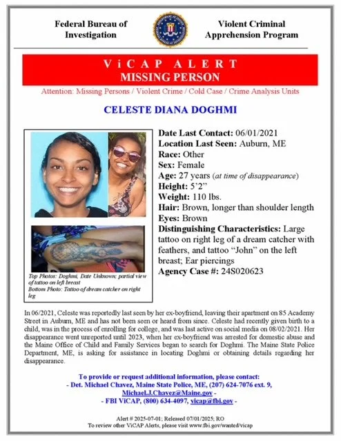 Stephanie reached out to a Department of Health and Human Services’ Office of Child and Family Services caseworker about Celeste’s child, and the caseworker showed up to the apartment to try and locate Celeste but instead came upon a scene she described as “living in a war zone.” Celeste’s son was seized and taken by the state when John was arrested. At the time of her disappearance, Celeste Doghmi was 5’2” and weighed 110 pounds. She is a Black woman with curly brown hair and eyes, has multiple ear and facial piercings and a large tattoo on her right leg of a dream catcher with feathers. Anyone with any information on the whereabouts of Celeste Doghmi is asked to please call Maine State Police Major Crimes Unit at (207) 624-7076 or the Auburn Police Department's anonymous tip line at 207-333-6653.